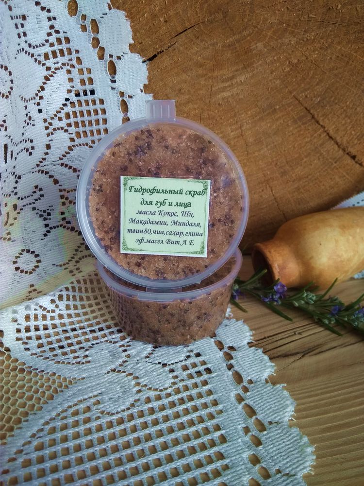 Состав: Масла Кокоса, Ши(карите), Макадамии, Миндальной косточки, натуральный эмульгатор, сахар, семена Чиа, Розовая глина, СО2 экстракт Гранатовой косточки. эфирные масла Пальмароза, Пачули, Мандарин.