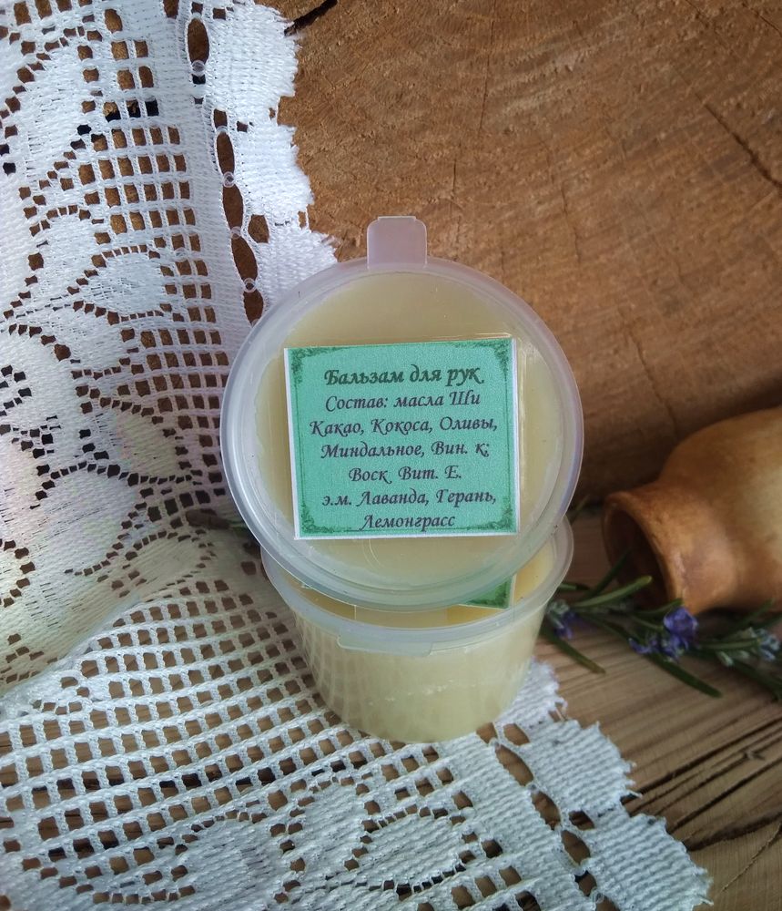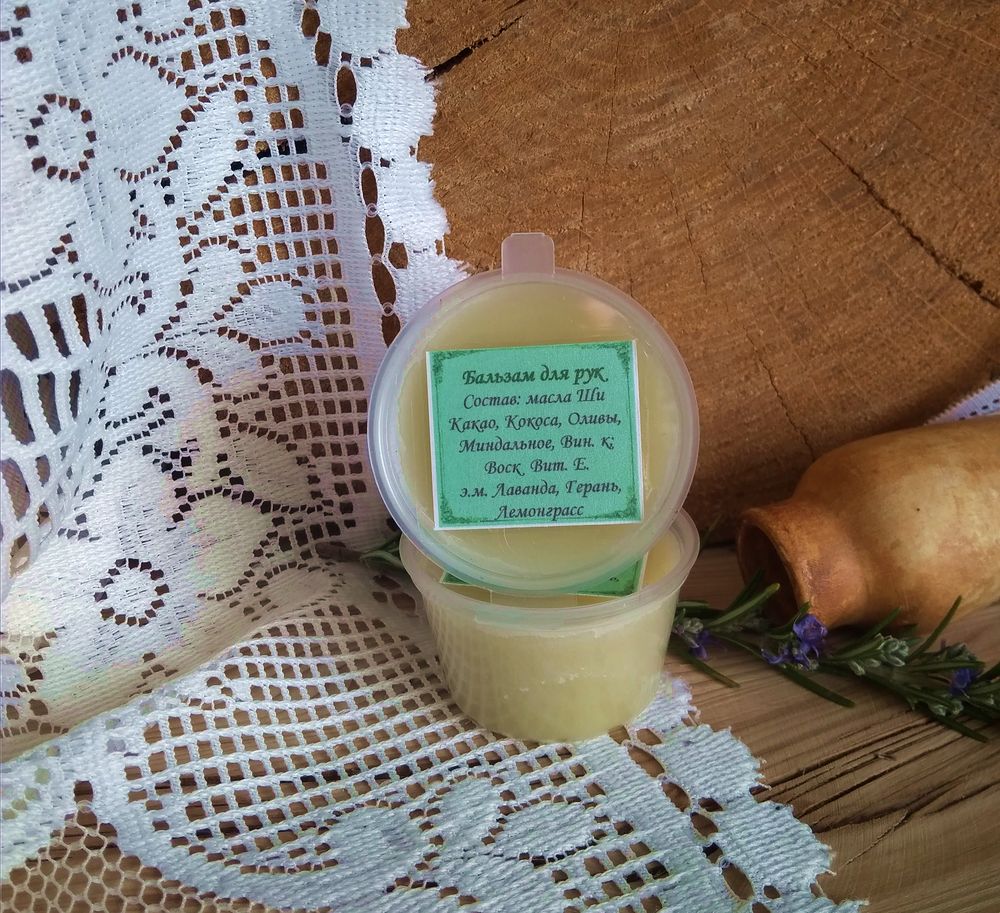 Состав: масла Какао, Кокоса, Ши(карите), Миндальной косточки, Виноградной косточки, Оливы, Воск пчелиный. Витамин Е. Эфирные масла Лемонграсс, Герань, Лаванда.